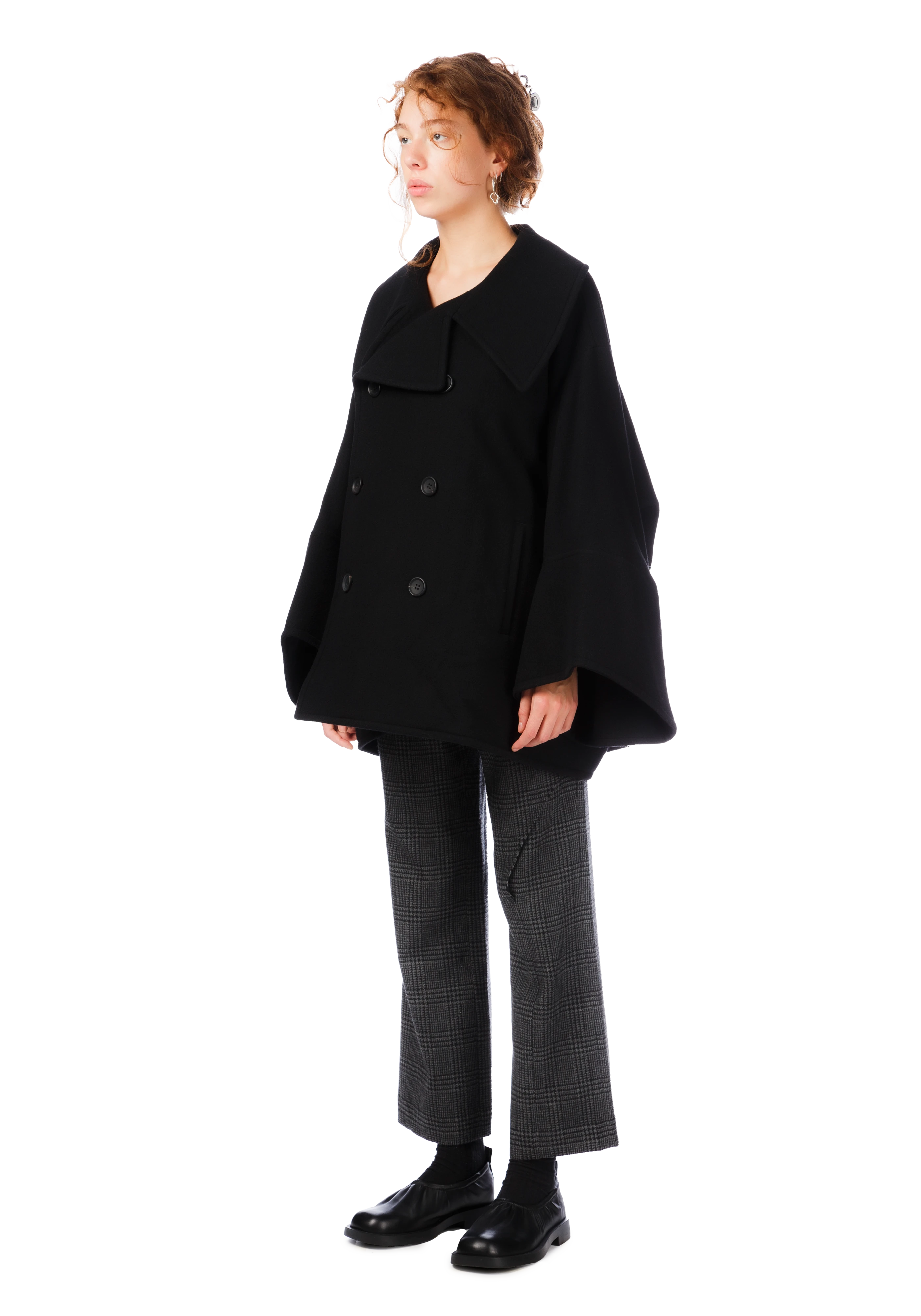 Long-sleeve oversized melton coat in black.