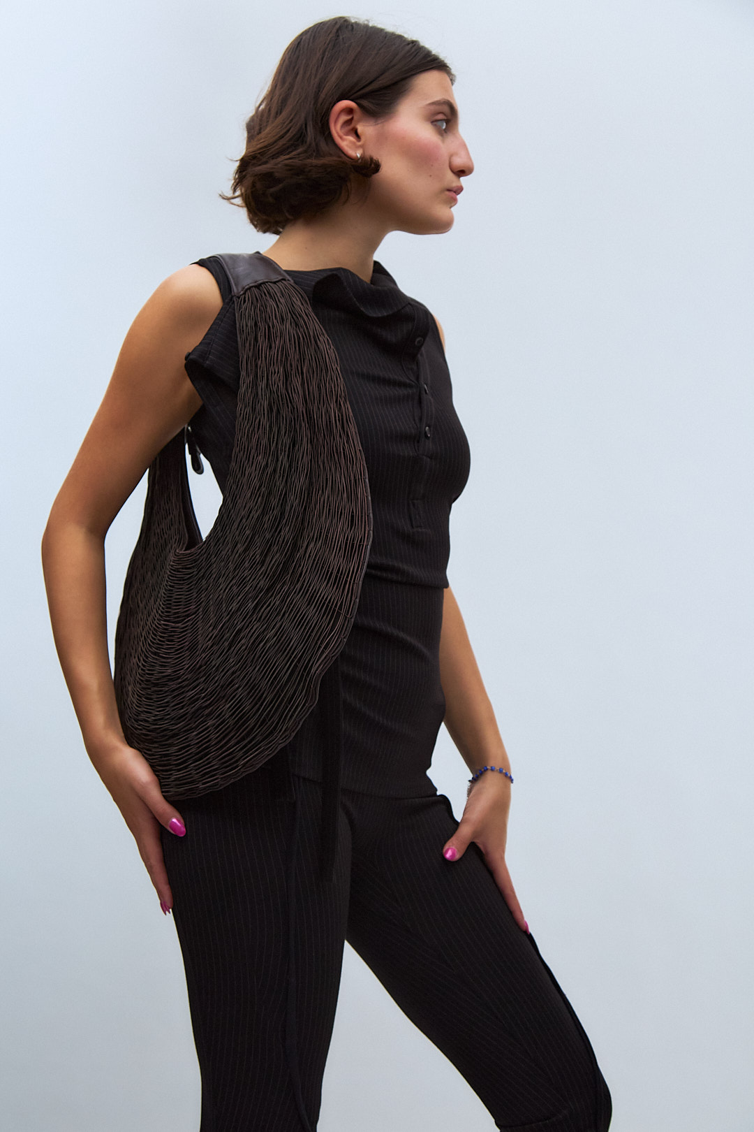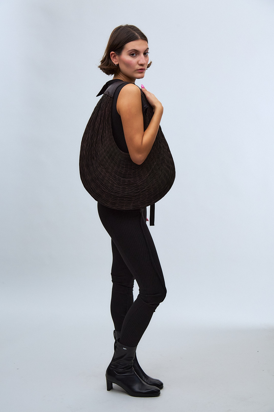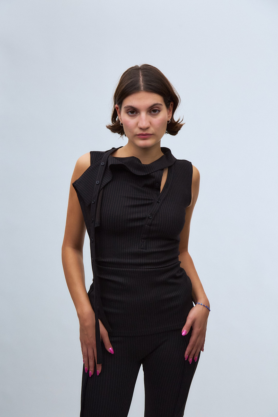 · Rib knit asymmetrical scoop neck, hem, and cuffs
