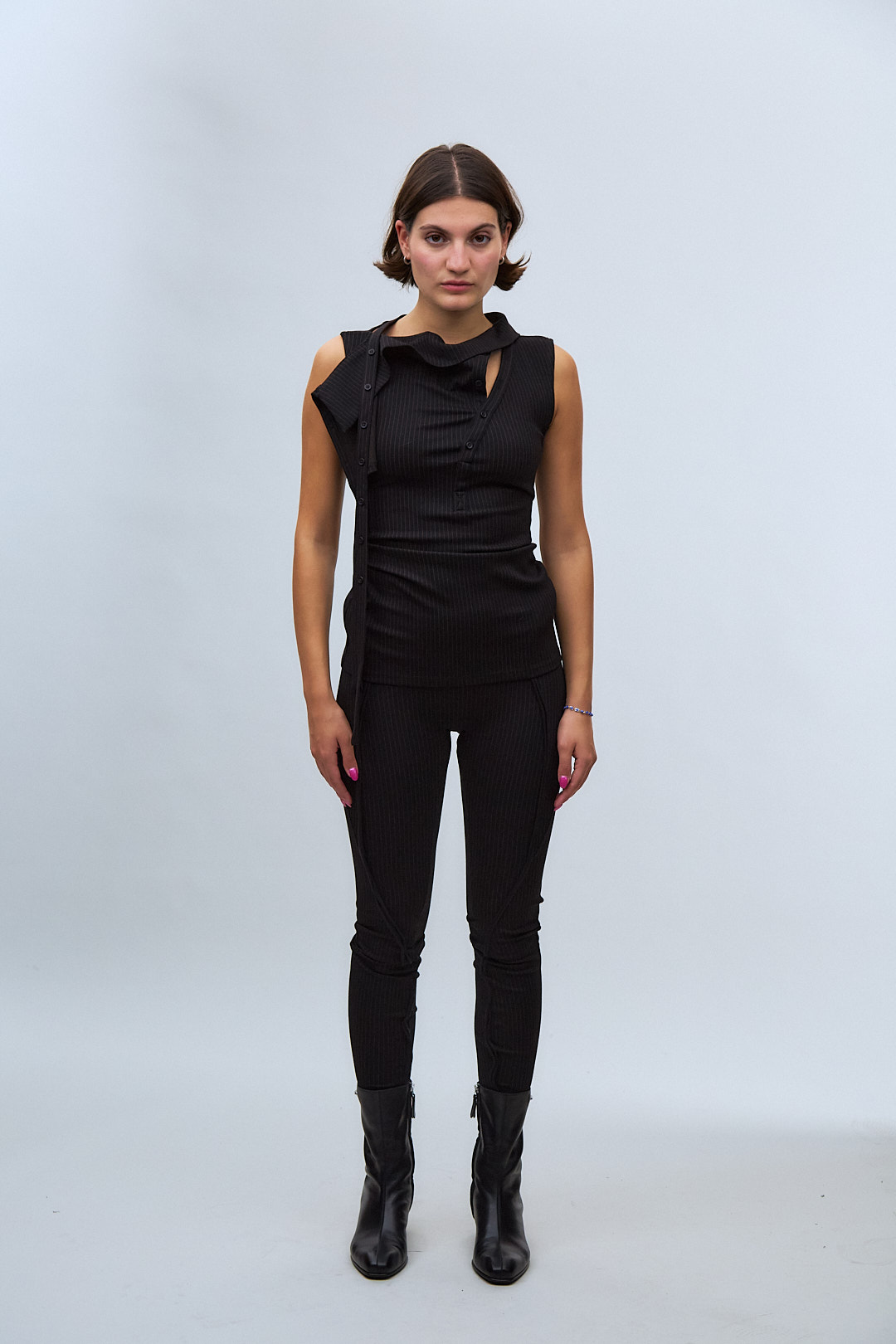 Sleeveless asymmetric stretch jersey top in black pinstripe.