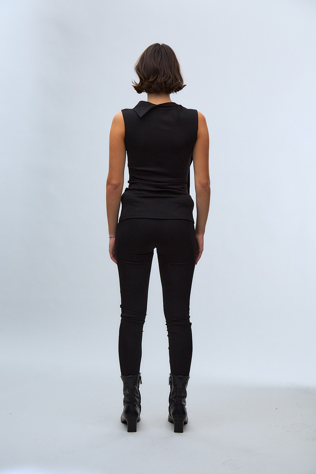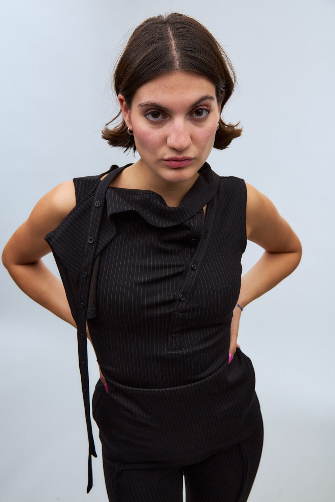 Sleeveless asymmetric stretch jersey top in black pinstripe.