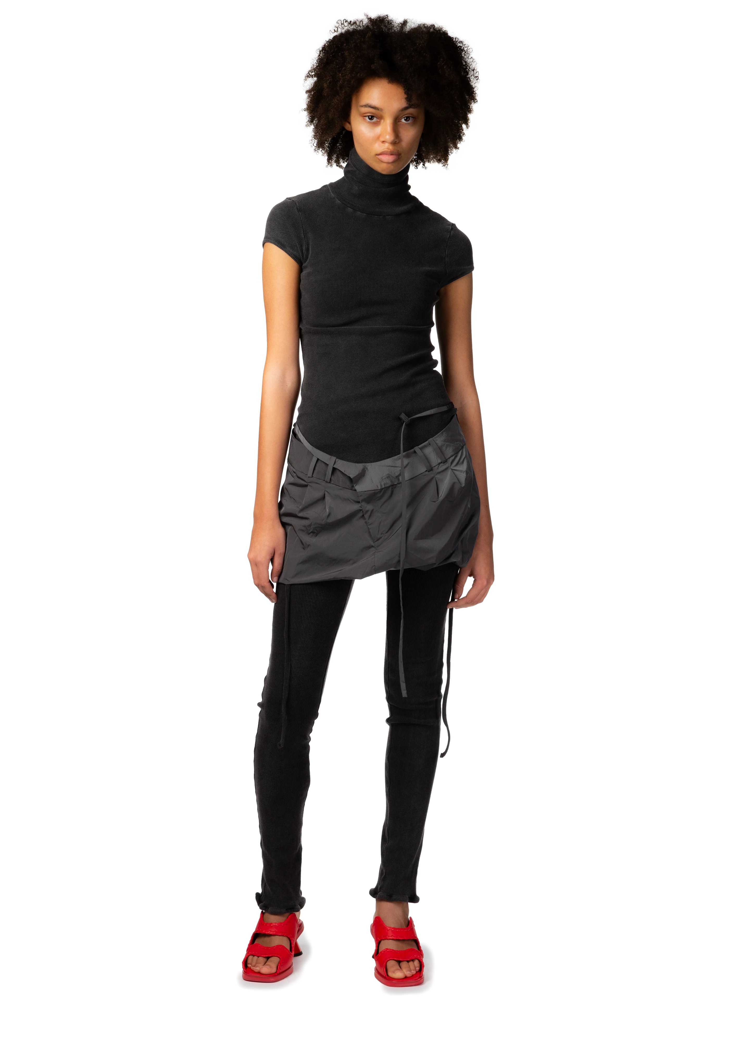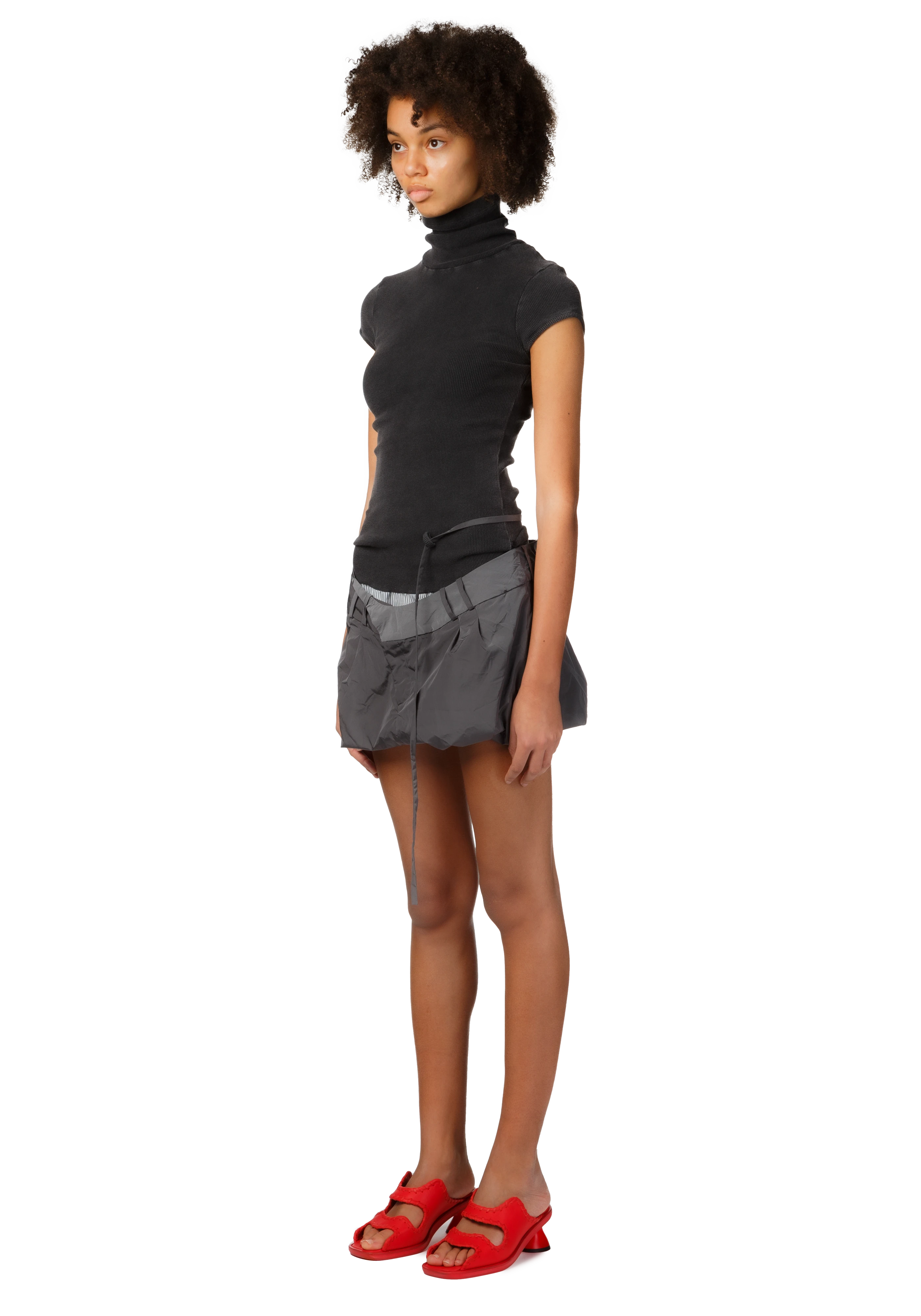 Short-sleeve stretch rib knit organic cotton and nylon taffeta dress in black wash.