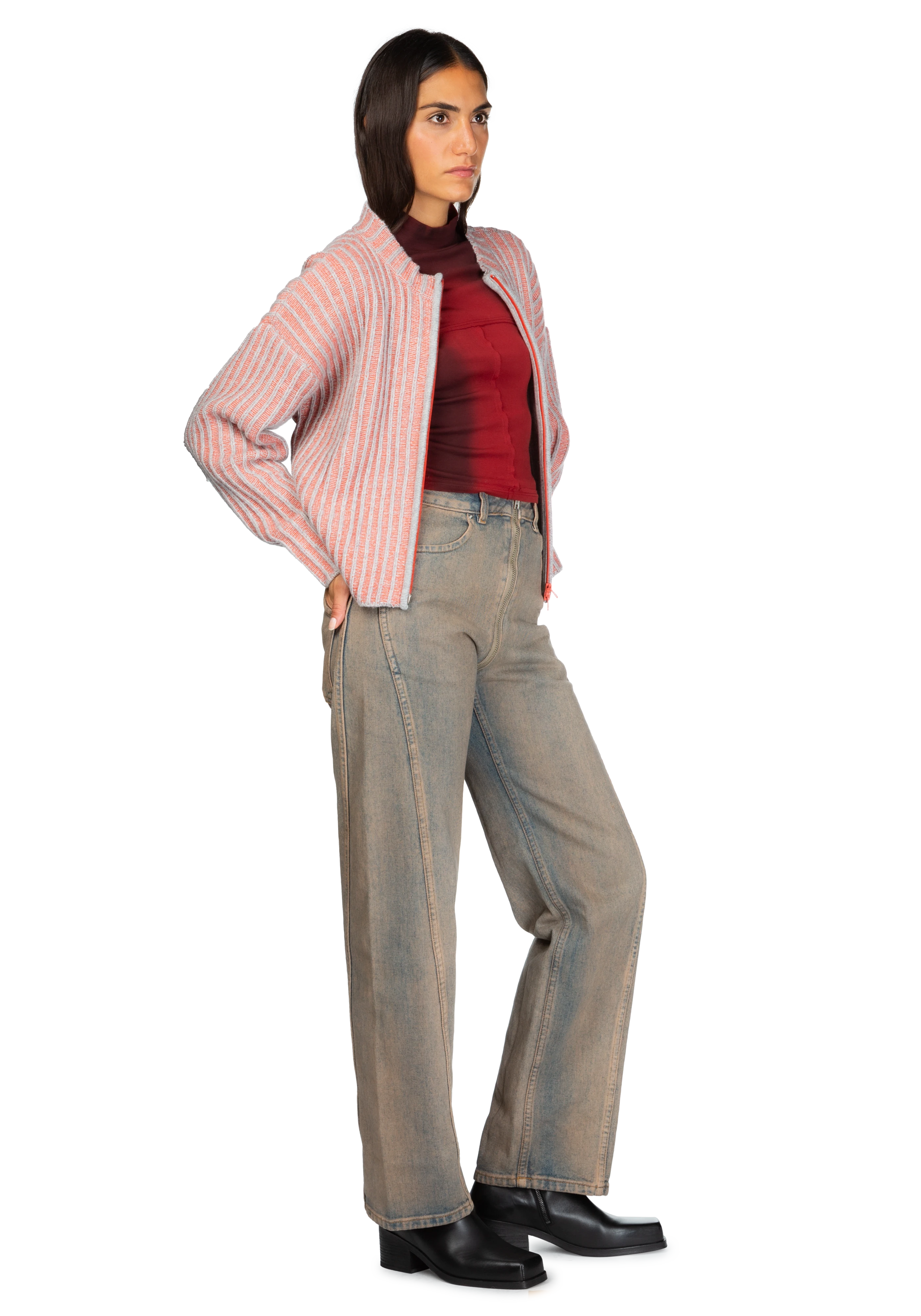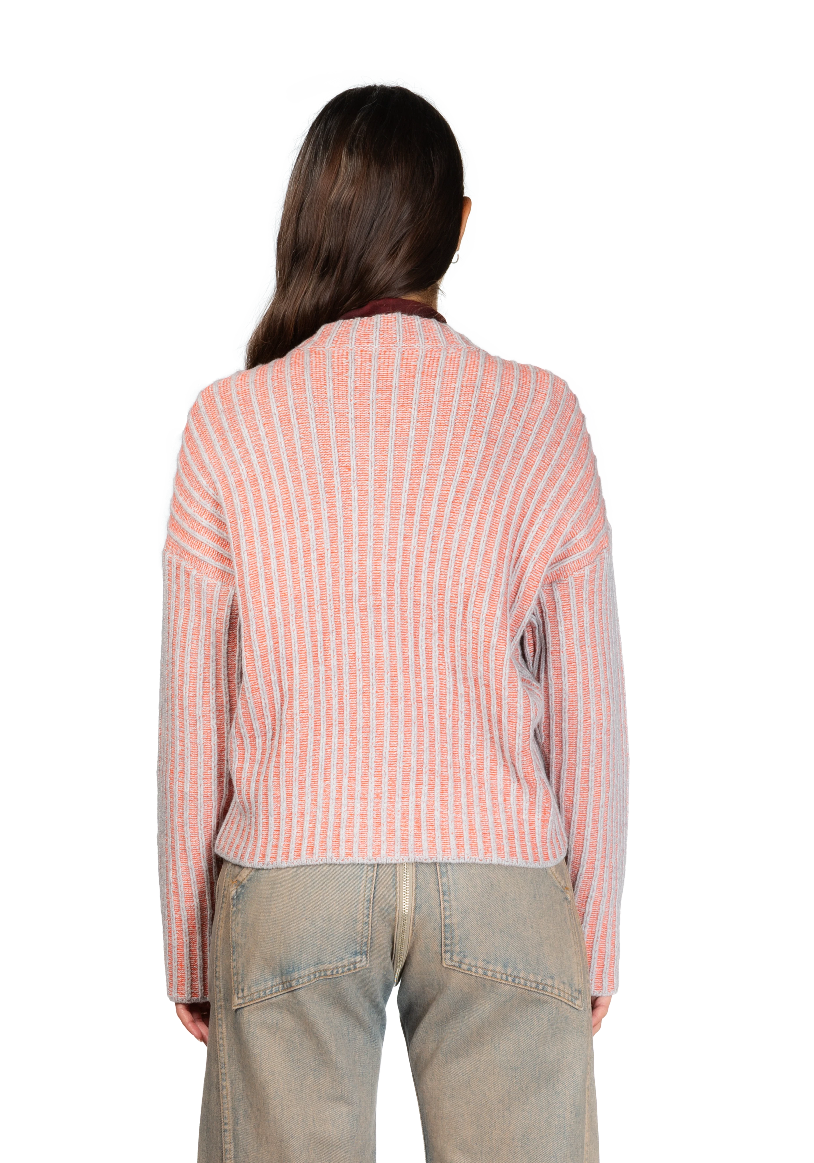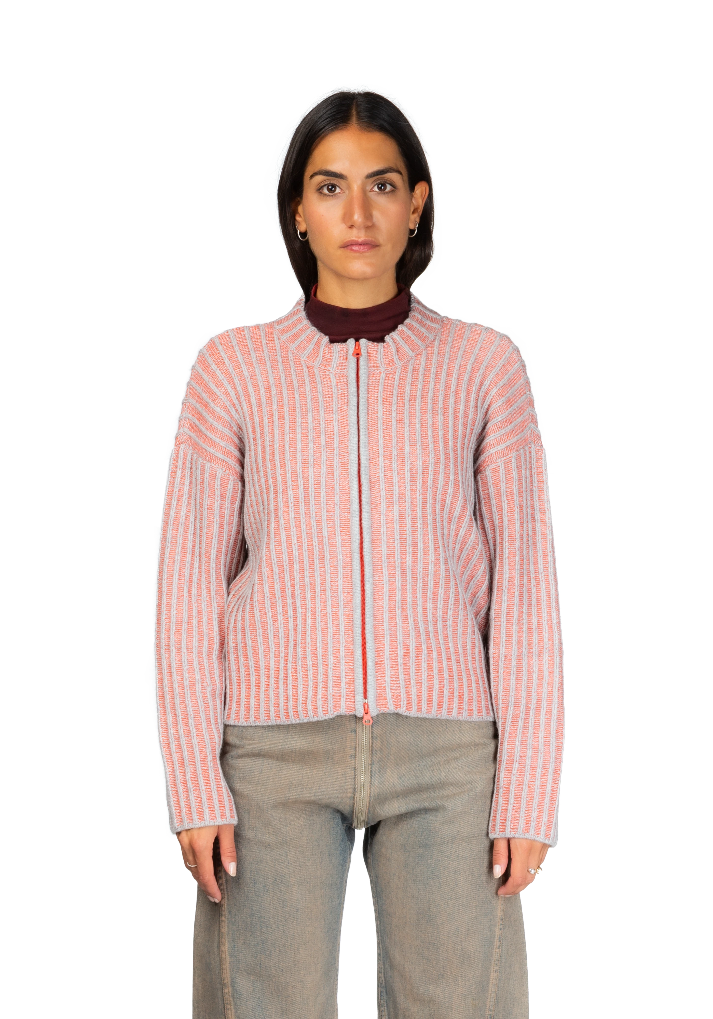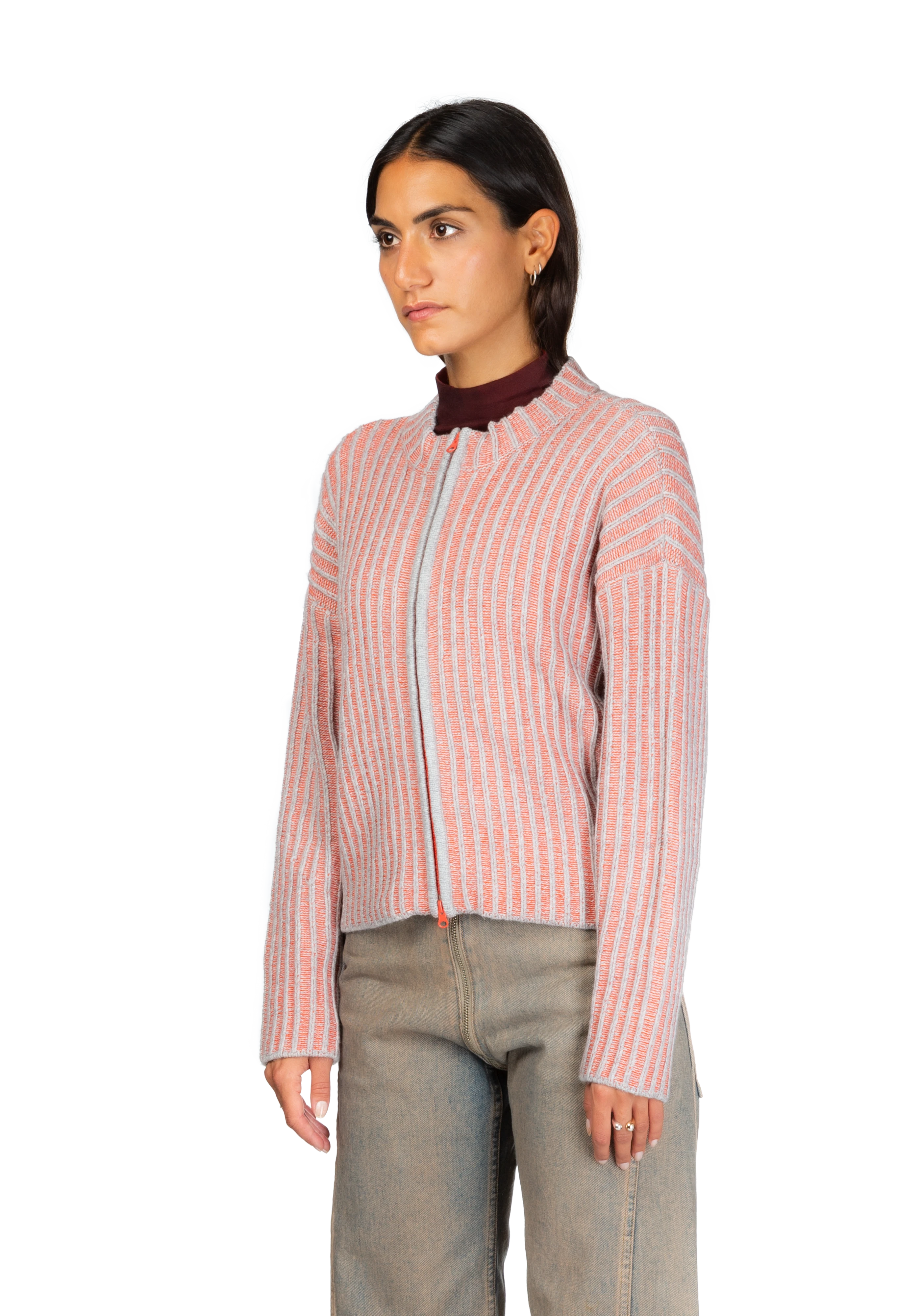 Long-sleeve rib-knit wool-blend cardigan in gray and red.