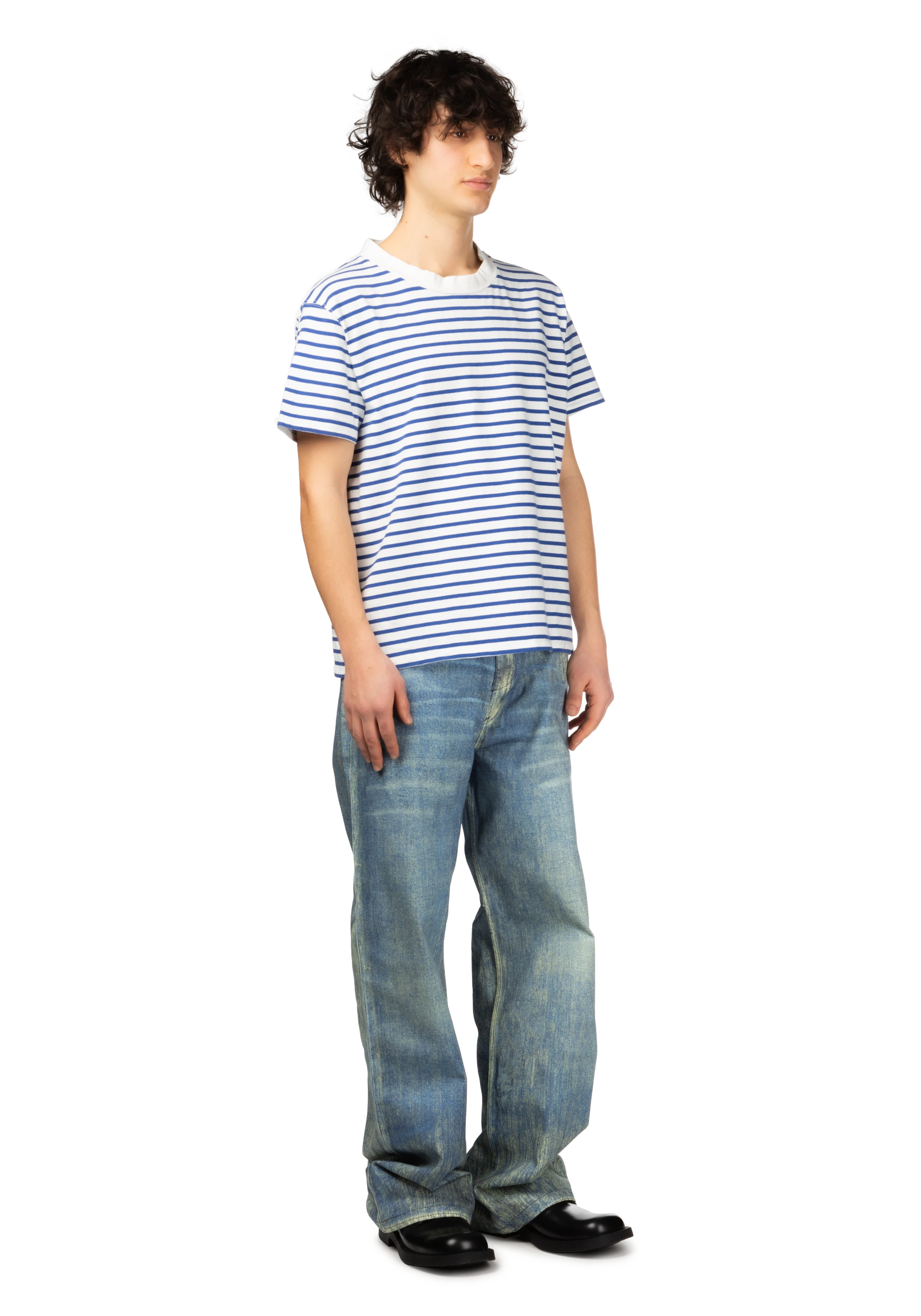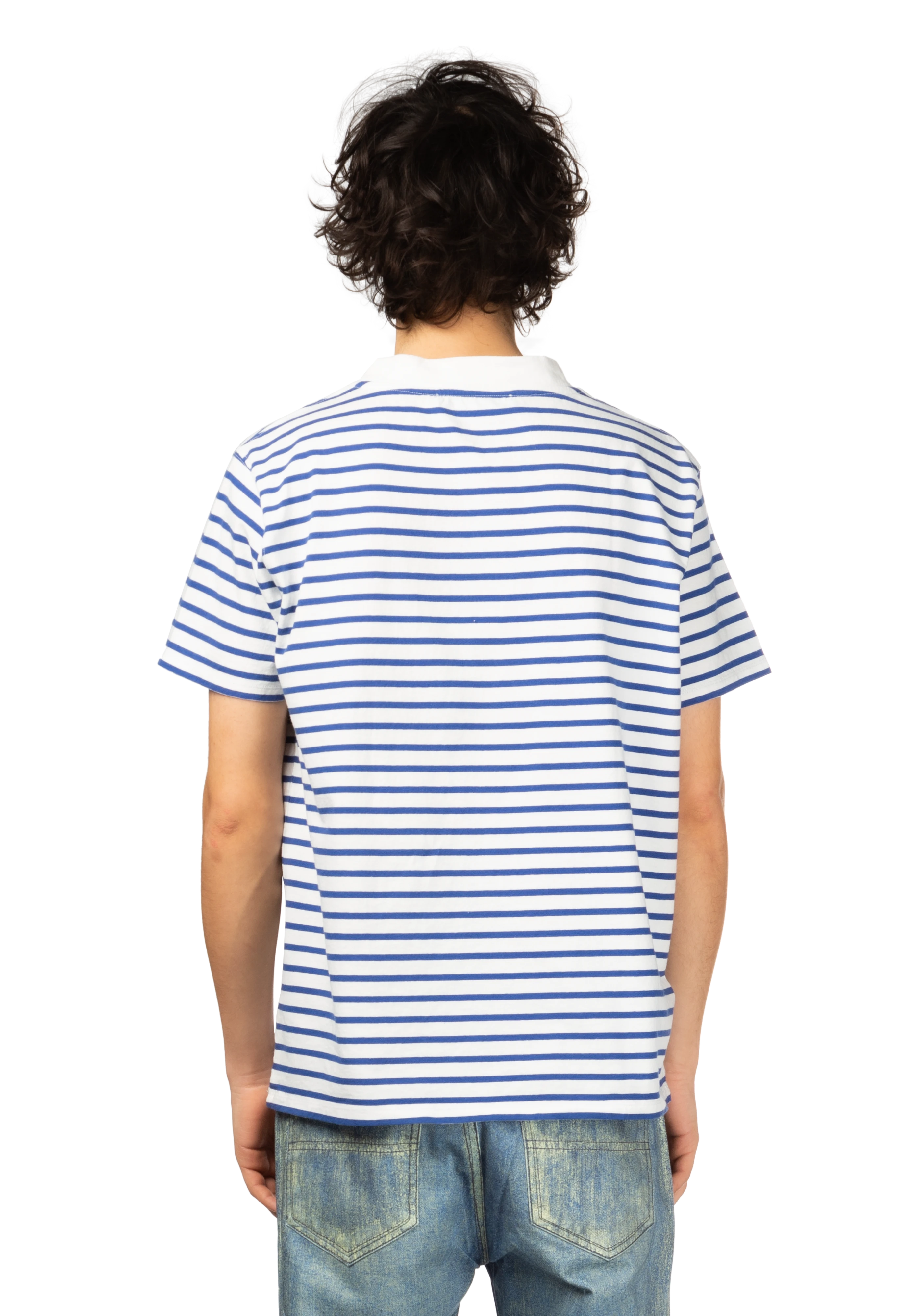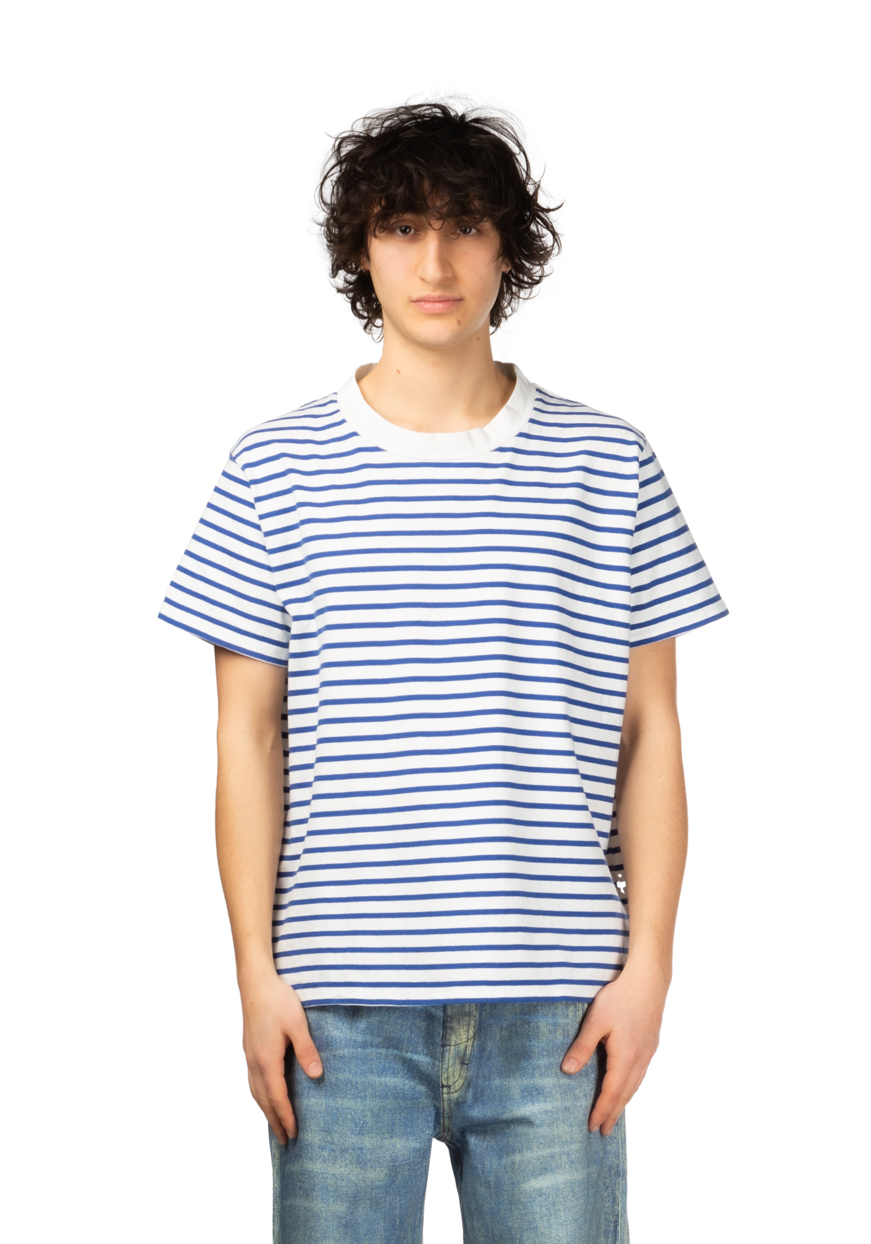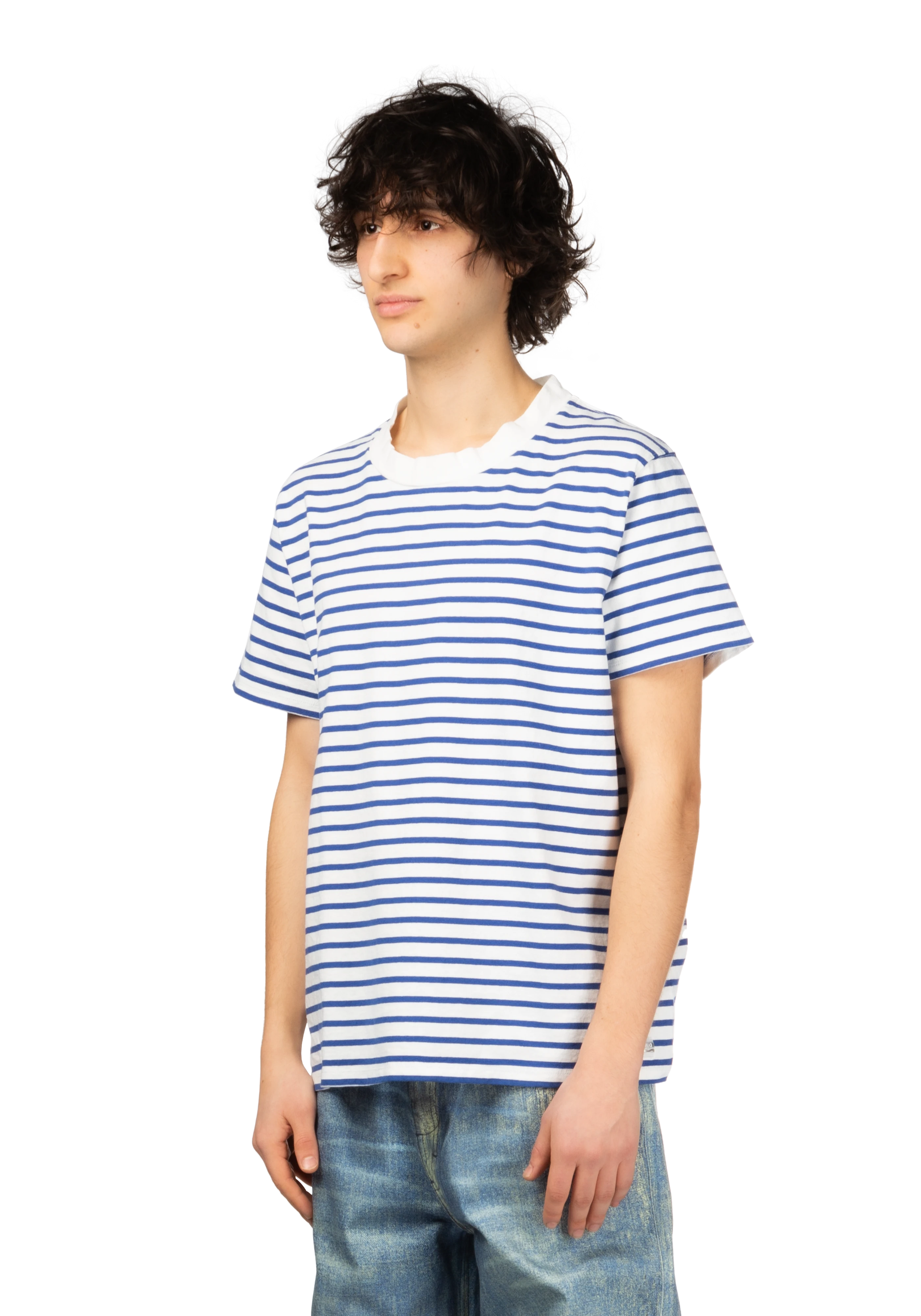 Short-sleeve jersey t-shirt in blue and white stripes.