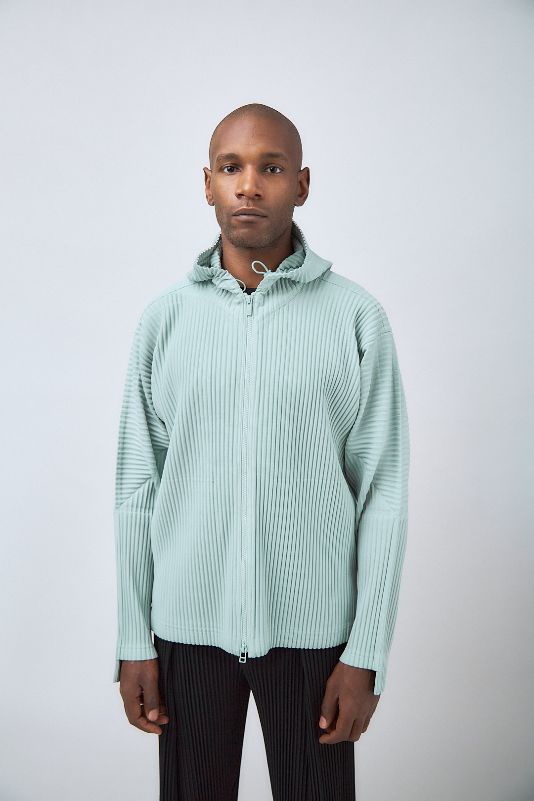 Long-sleeve lightweight garment-pleated hoodie in sericite blue.