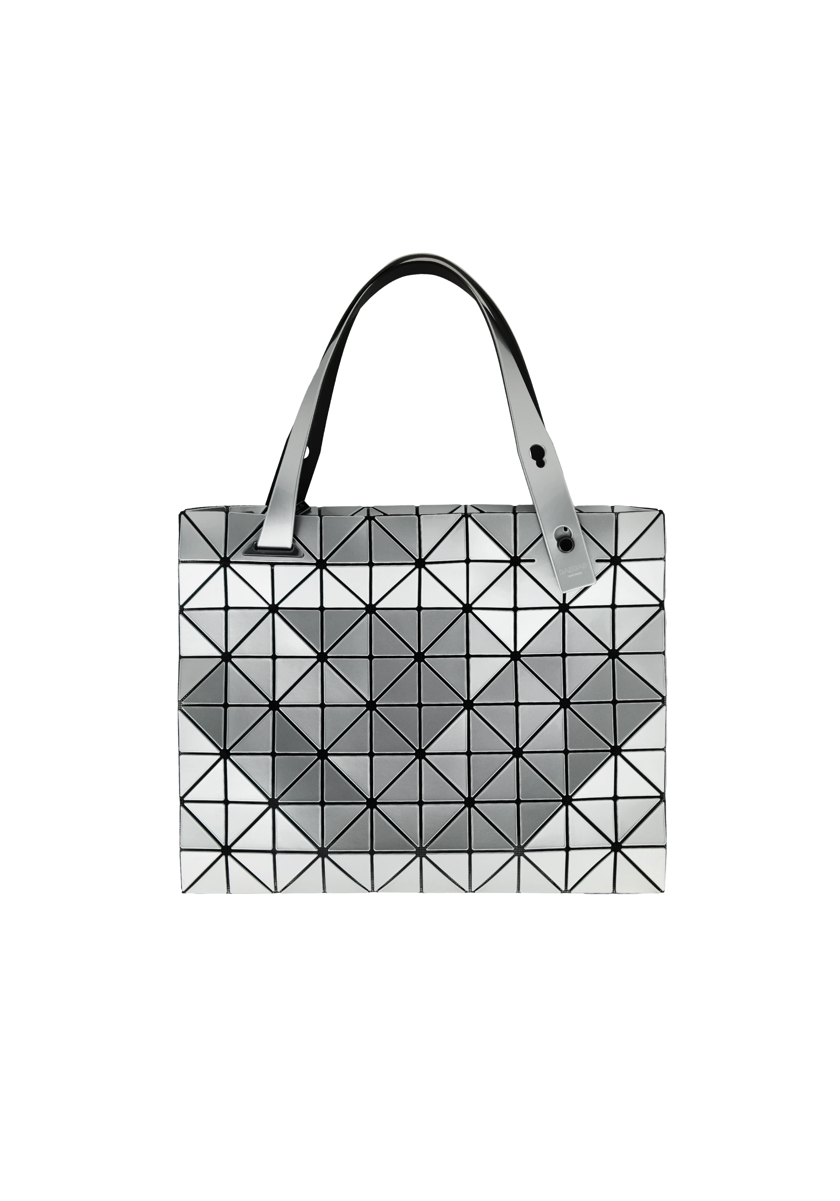 Mesh handbag with triangular vinyl appliqués in silver.